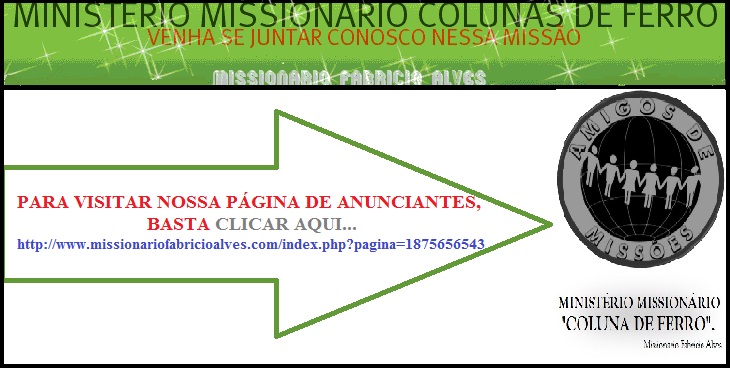 1º - Você deve visitar nossa página de ANUNCIANTES, pelo período de 40 segundos e deixar nela seu comentário, crítica e ou elogios. ( Lembramos que nessa página estará publicado propagandas e divulgação de empresas, parcerias e pessoas que investe nesse Ministério - quanto mais visitas forem registradas nessa página, mais prazer terão em investir no Ministério. E assim poderemos buscar parceiras entre eles para que possamos nos meses futuros, sortearmos mais brindes e prêmios para vocês, ao invés de tão somente exemplares de livros de nosso Ministério).