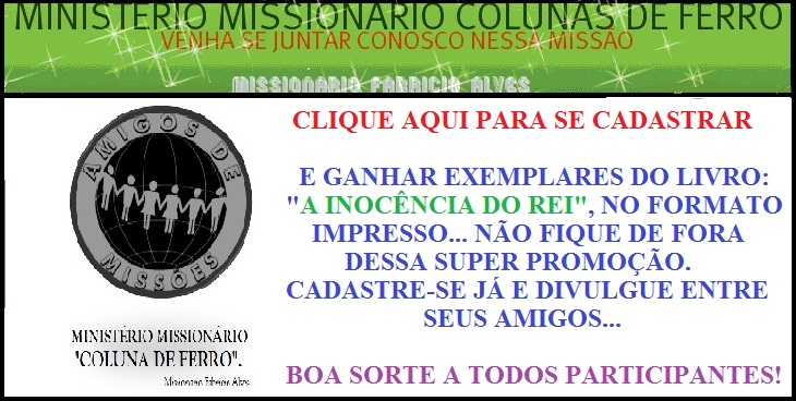 Nosso Ministério resolver agora premiar os nossos amigos, parceiros e aos visitantes do nosso site com uma super promoção. Todo mês será sorteado exemplares do livro impresso "A Inocência do Rei" entre todos os nossos parceiros que se cadastrarem nessa magnífica promoção.